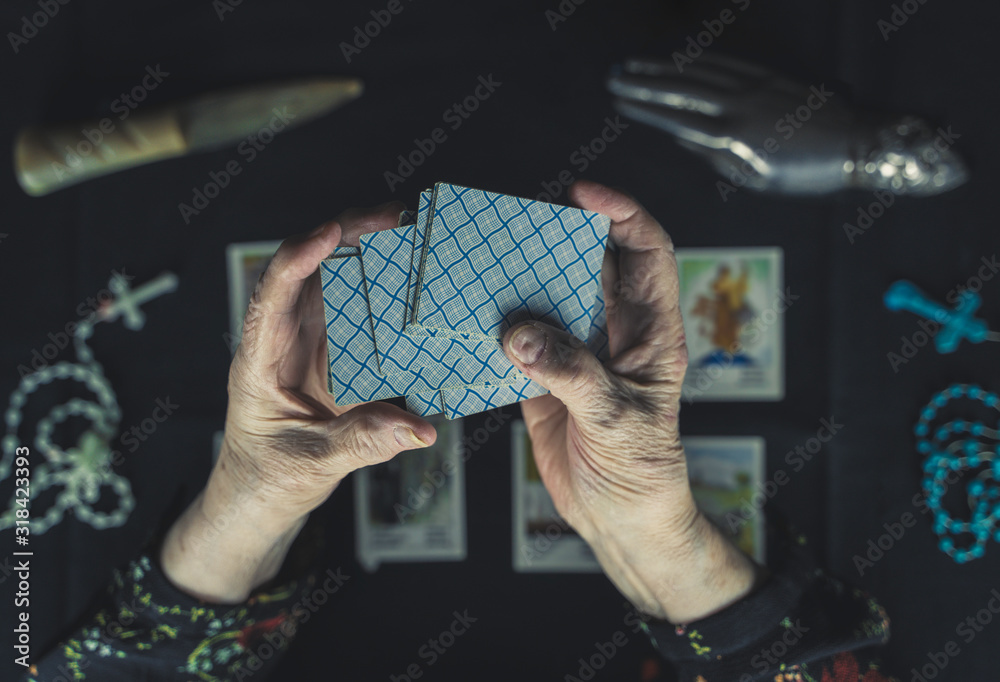 Old Woman Shuffle Tarot Cards Above Other Tarot Cards Old Wrinkeld Hands Occult Fortune Telling Concept Picture Taken From Above Stock Photo Adobe Stock